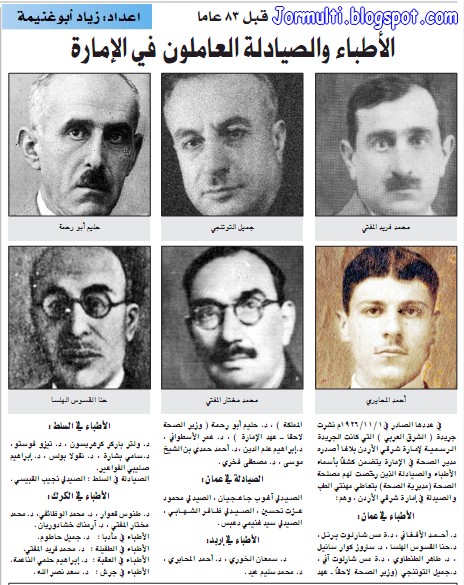 في عددها الصادر في 1 ـ 11 ـ م1926 نشرت جريدة ( الشرق العربي ) التي كانت الجريدة الرسمية لإمارة شرقي الأردن بلاغا أصدره مدير الصحة في الإمارة يتضمن كشفاً بأسماء الأطباء والصيادلة الذين رخّصت لهم مصلحة الصحة (مديرية الصحة) بتعاطي مهنتي الطب والصيدلة في إمارة شرقي الأردن ، وهم :