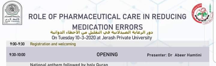 يوم الثلاثاء الموافق 10/ 3 / 2020، في قاعة الندوات – كلية الصيدلة – جامعة جرش- جرش – الأردن، من الساعة 9:00 صباحاً – 4:00 مساءً