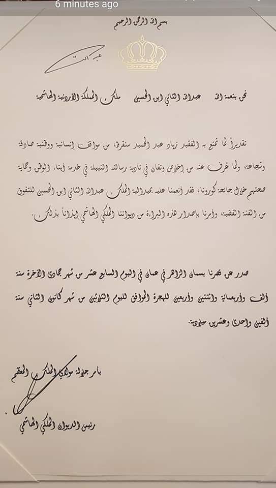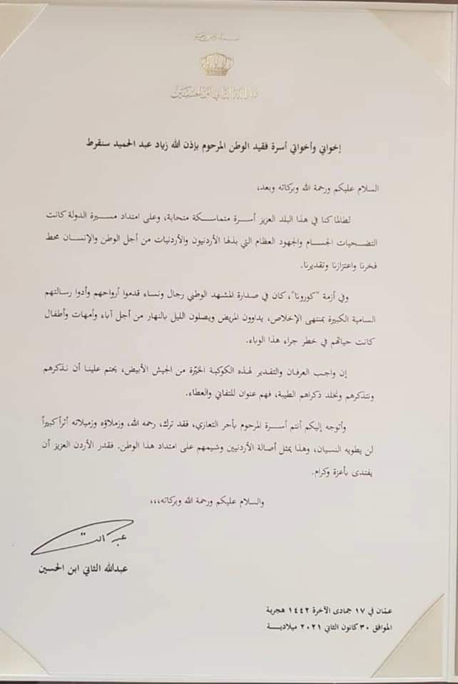 تكرمنا اليوم بزيارة خاصة من قبل مندوبي جلالة الملك عبدالله الثاني المفدى يترأسهم العقيد علي بيك المومني لاستلام رسالة شكر و مواساة من جلالة سيدنا بالإضافة لوسام الملك عبدالله الثاني ابن الحسين الفضي على جهود المرحوم بإذن الله والدي الدكتور زياد سنقرط الذي كان له الدور الكبير في تأسيس الصناعة الدوائية بالأردن و الذي استمر في خدمة بلده و في تقديم الخدمة الصحية لأبناء هذا البلد خلال فترة جائحة كورونا حتى أصيب بهذا المرض و توفاه الله مع عدد من زملائه في الكادر الطبي. نسأل الله أن يحتسبه من شهداء هذا الوباء و يدخله الجنة بغير حساب ولا عذاب. و نتقدم بالشكر الجزيل لمليكنا المفدى جلالة الملك عبدالله بن الحسين المعظم لهذه اللفته الكريمة والتي لها الدور الكبير في تخفيف مصابنا في ذكرى عيد ميلاده التاسع و الخمسون، أدامه الله تاجا” على رؤوسنا و حفظه الله من كل سوء.