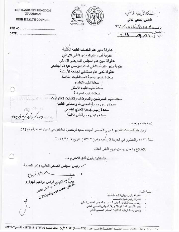 نود اعلامكم بصدور تعليمات التطوير المهني المستمر لغايات تجديد ترخيص العاملين في المهن الصحية رقم 1 لسنة 2021