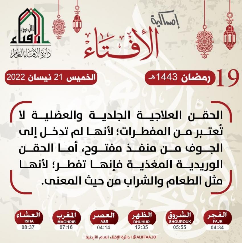 وفيما يخص الحقن الوريدية المغذية، قالت دائرة الافتاء إنها “مفطرة” لأنها مثل الطعام والشراب من حيث المعنى.