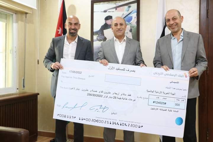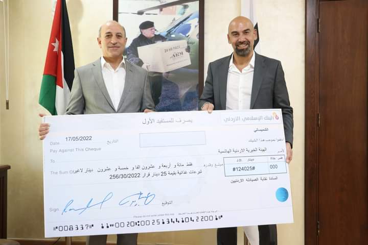 سلم نقيب صيادلة الأردن الدكتور زيد روحي الكيلاني لأمين عام الهيئة الخيرية الأردنية الهاشمية الدكتور حسين الشبلي اليوم الخميس 19-5-2022 الجزء الأخير من تبرعات حملة ” من أردن الشهامة إلى فلسطين الكرامة ” والتي تهدف لإغاثة ونصرة أهلنا في فلسطين ودعم صمودهم في وجه الاحتلال الصهيوني الغاشم لتواصل نقابة الصيادلة مسيرتها في دعم القضية الفلسطينية في كل وقت وحين حتى التحرير القريب بإذن الله.