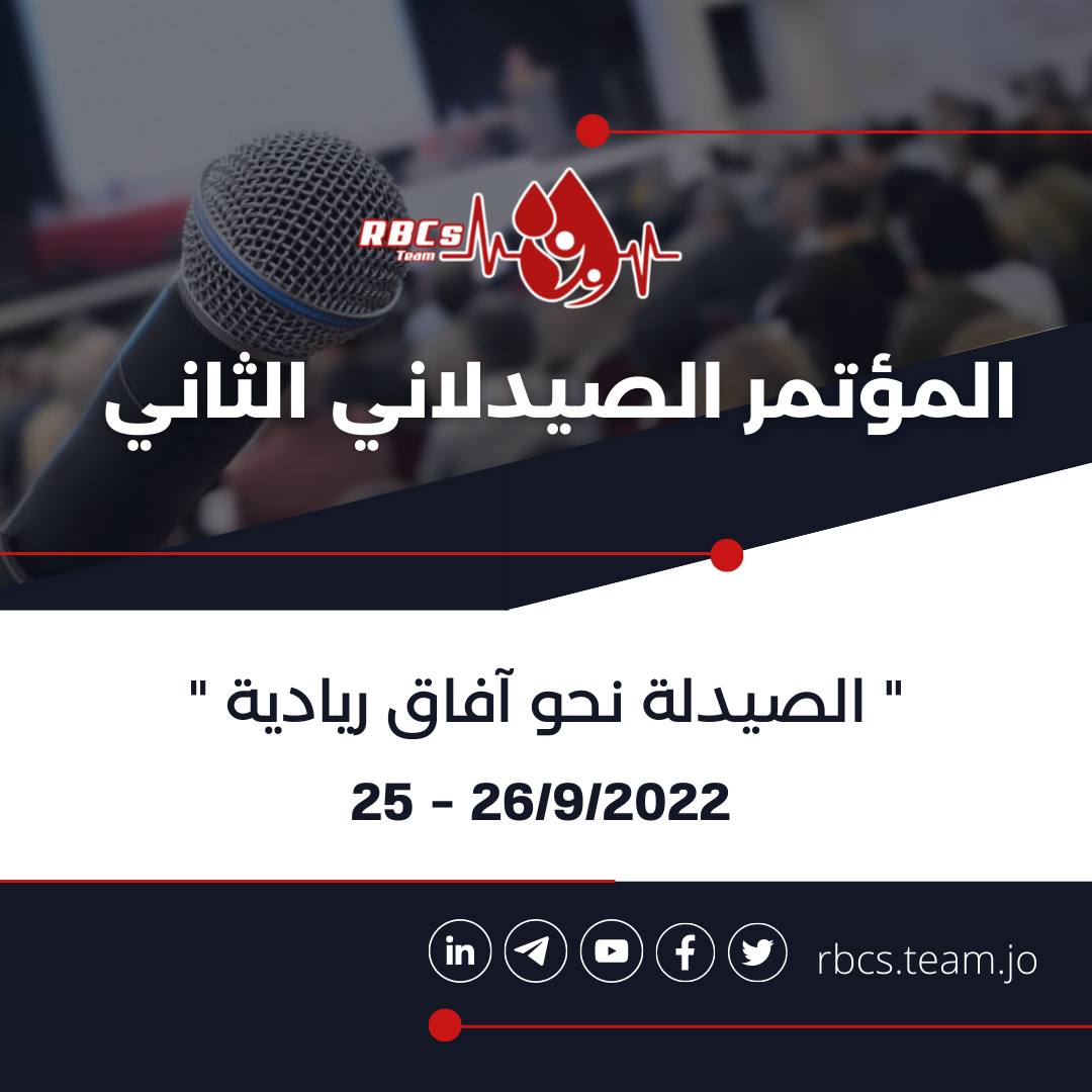 يعلن RBCs Team عن إطلاق المؤتمر الصيدلاني الثاني والذي يستهدف الصيادلة داخل المملكة الأردنية الهاشمية، والطلبة على مقاعد الدراسة في كليات الصيدلة .