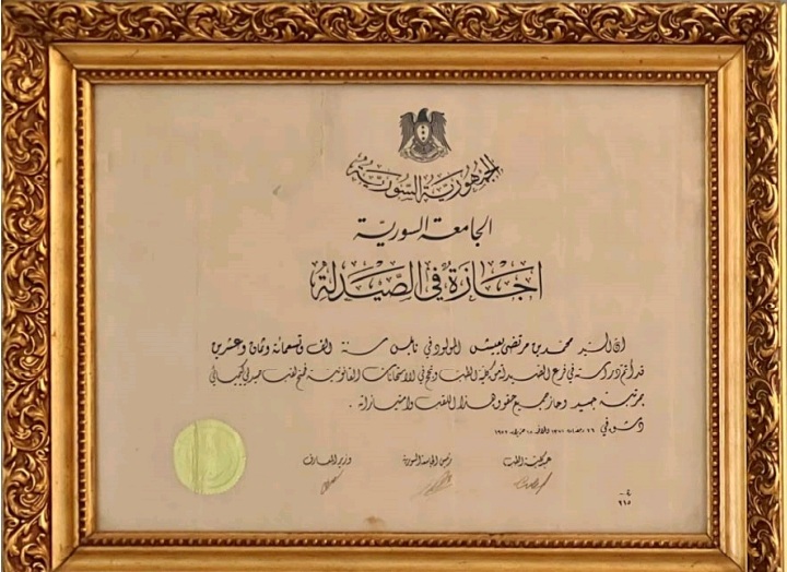 وتشير الوثائق ان الزميل د. محمد مرتضى يعيش، حصل على شهادته في الصيدلة من الجامعة السورية في دمشق في العام ١٩٥٢، وحصل على ترخيص مزاولة المهنة بتاريخ ١٨ / ٦ / ١٩٥٢م.