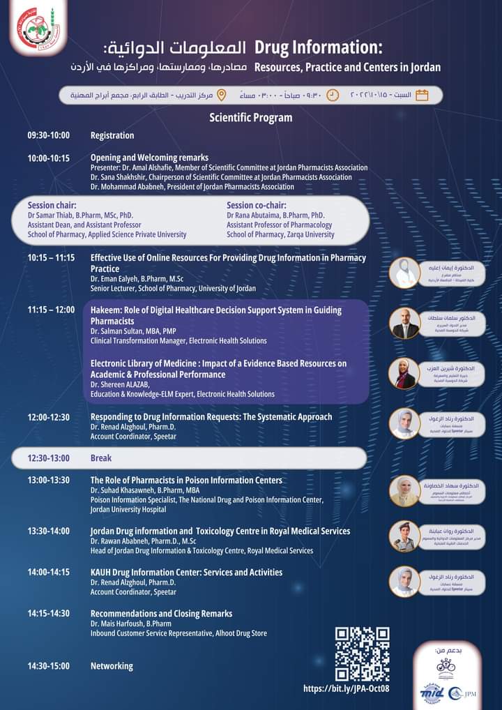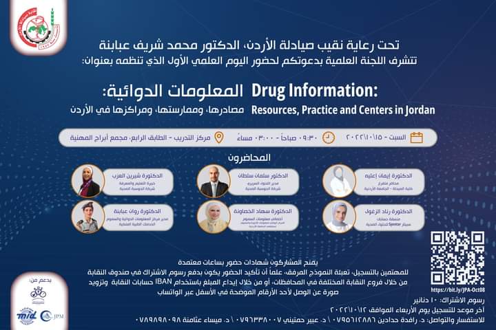 وسيقام اليوم العلمي الاول للجنة العلمية؛ تحت رعاية نقيب صيادلة الأردن، الدكتور محمد شريف عبابنة، وبدعم من احد مستودعات الأدوية ؛ بعنوان: