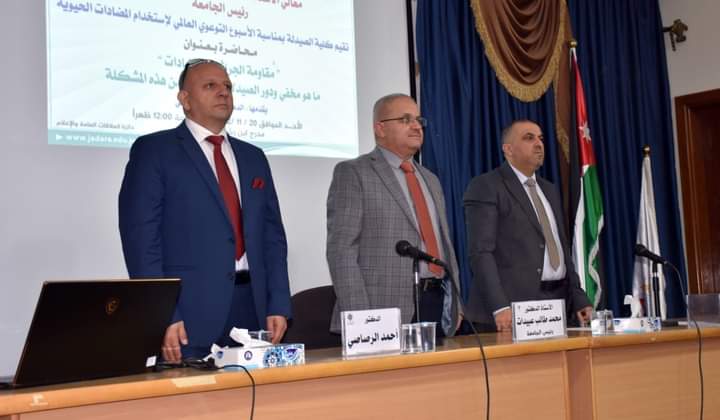 ومن جانبه قام الدكتور احمد الرصاصي بتقديم عرض مفصل حول كيفية اكتشاف البنسلين، وبيان اهميته منذ بداية اكتشافه وانتشاره، اضافة الى تطور علم المضادات الحيوية وآثارها السلبية والإيجابية على صحة الإنسان، ومراحل تطور صناعتها، وبيان أهمية دور الصيدلاني في هذا المجال، مؤكدآ على أن مشكلة مقاومة البكتيريا للمضادات الحيوية هي مشكلة كبيرة تهدد العالم، لذا علينا معرفة الاسباب التي تساعد على منع تفاقم هذه المشكلة وزيادة الابحاث والدراسات في هذا المجال، كما عرض الرصاصي الوضع في الأردن من ازدياد حالات البكتيريا المقاومة للمضادات.