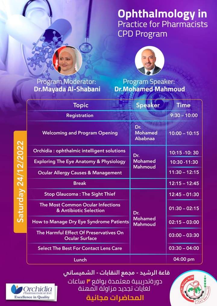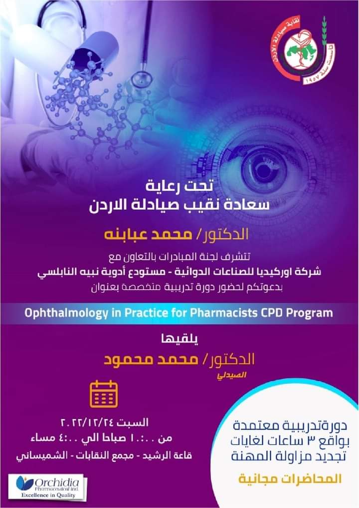 تتشرف لجنة المبادرات /نقابة صيادلة الأردن بدعوة جميع صيادلة الأردن من مختلف القطاعات لحضور الدورة التدريبية الاولى من نوعها والمتخصصة بالعيون و بالتعاون مع شركة اوركيديا للصناعات الدوائية – مستودع أدوية نبيه النابلسي بعنوان :