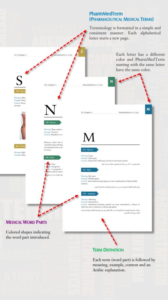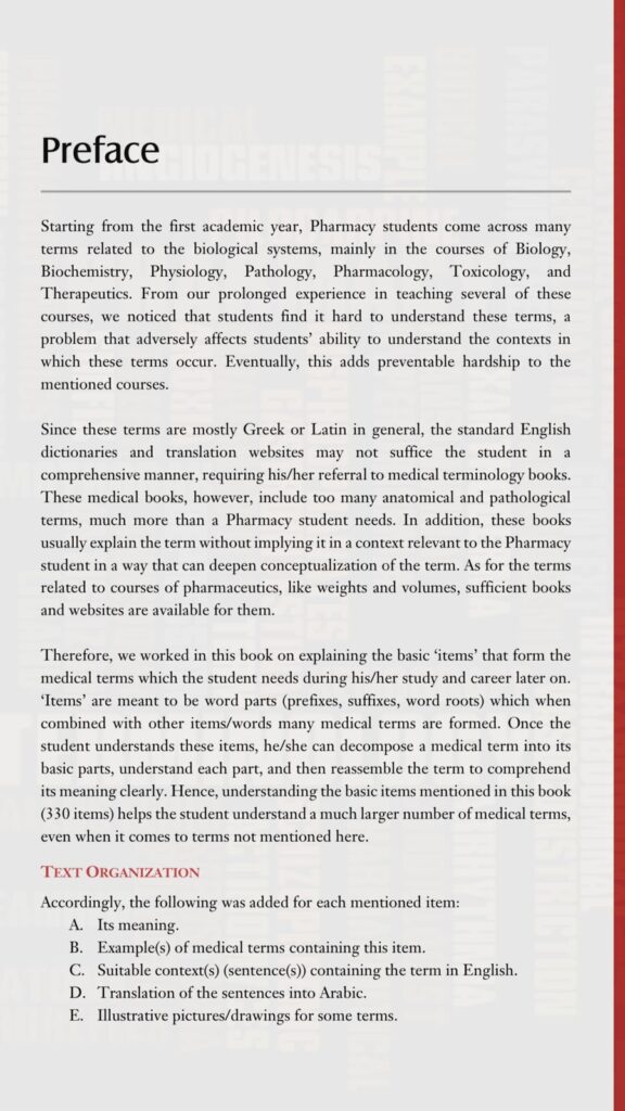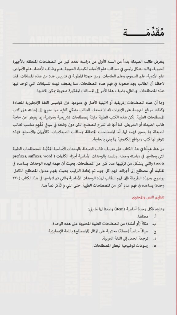 تم تحضير الكتاب لمساعدة طلاب الصيدلة في جميع مراحل دراستهم لتعلم المصطلحات المتعلقة بالاجهزة الحيوية وذلك بشكل رئيسي في مساقات علم الأحياء، الكيمياء الحيوية، علم وظائف الأعضاء، علم الأمراض، علم الأدوية، علم السموم، وعلم العلاجات.