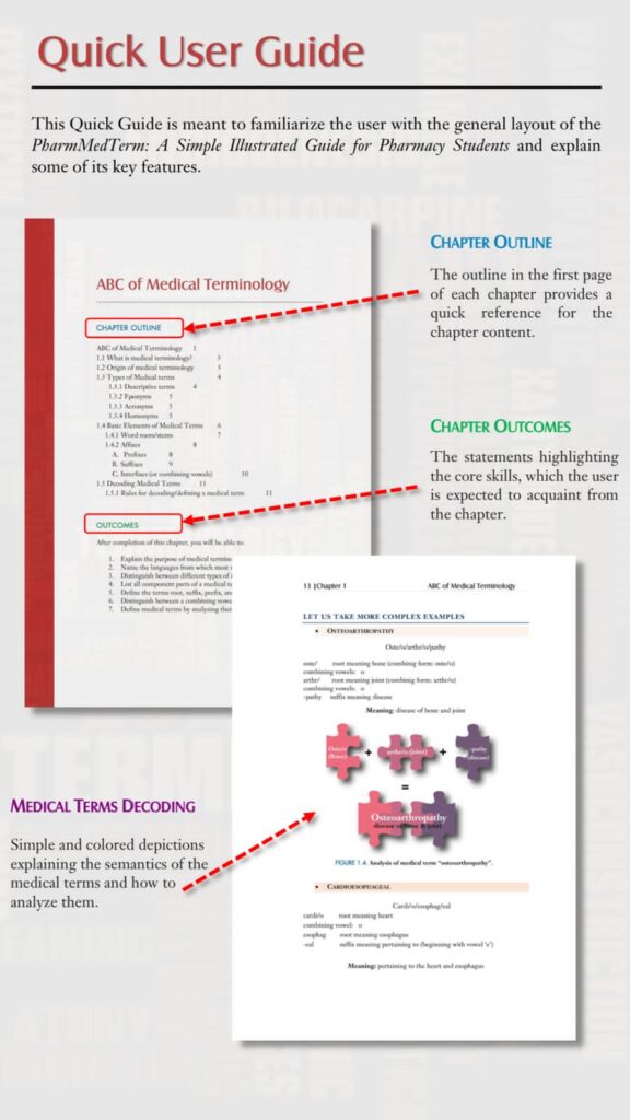 وﺑﻤا أن هذه المصطلحات إغريقية أو لاتينية الأصل في عمومها، فإن قواميس اللغة الإنجليزية المعتادة وكذلك مواقع الترجمة على الإنترنت قد لا تسعف الطالب بشك كاف. يقوم هذا الكتاب على تعريف طالب الصيدلة بالوحدات الأساسية المكونة للمصطلحات الطبية التي يحتاجها في دراسته وعمله. ونقصد بالوحدات الأساسية أجزاء الكلمة (prefixes, suffixes, word root) والتي يتشكل من تركيبها عدد كبير من المصطلحات. بحيث أن فهمه لهذه الوحدات يساعده في