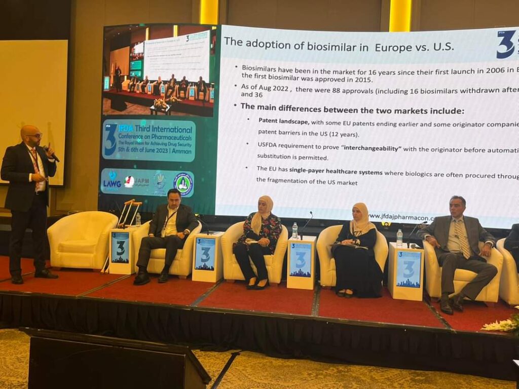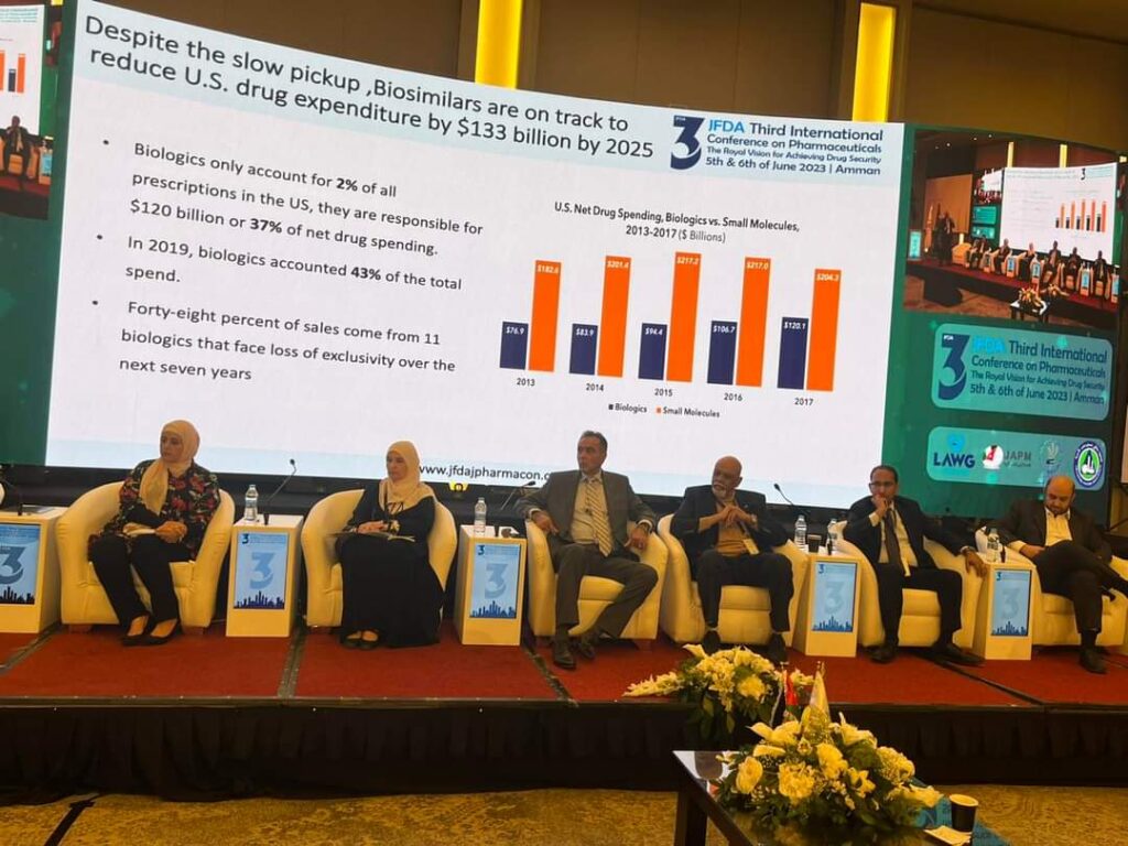 ضمن فعاليات مؤتمر الدواء الدولي الثالت بعنوان “الرؤى الملكية في تحقيق الأمن الدوائي”، عقدت الجلسة النقاشية الخامسة من جلسات المؤتمر حول سبل تمكين الصناعات البيولوجية والبيولوجية الشبيهه ودور الابتكارات الدوائية والأدوية ذات القيمة المضافة في الأمن الدوائي وتحقيق وصول الأدوية المبتكرة وذات القيمة المضافة إلى المرضى .