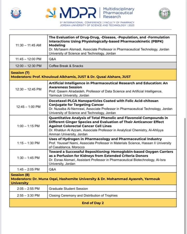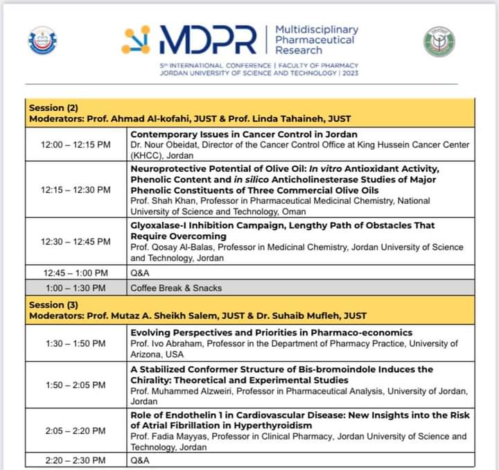 انطلقت في كلية الصيدلة في جامعة العلوم والتكنولوجيا اعمال المؤتمر الدولي الخامس لكلية الصيدلة برعاية الاستاذ الدكتور خالد السالم رئيس الجامعة ود.ساير العزام عميد كلية الصيدلة واعضاء الهيئة التدريسية وبحضور نخبة من المسؤولين والصيادلة من مختلف القطاعات.