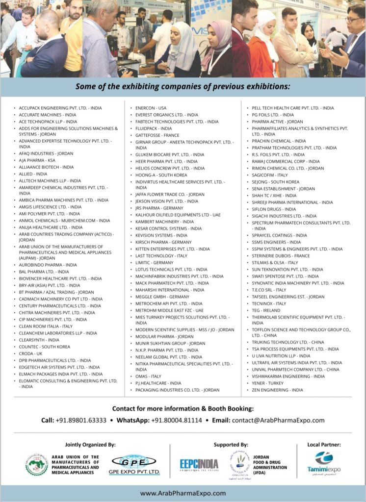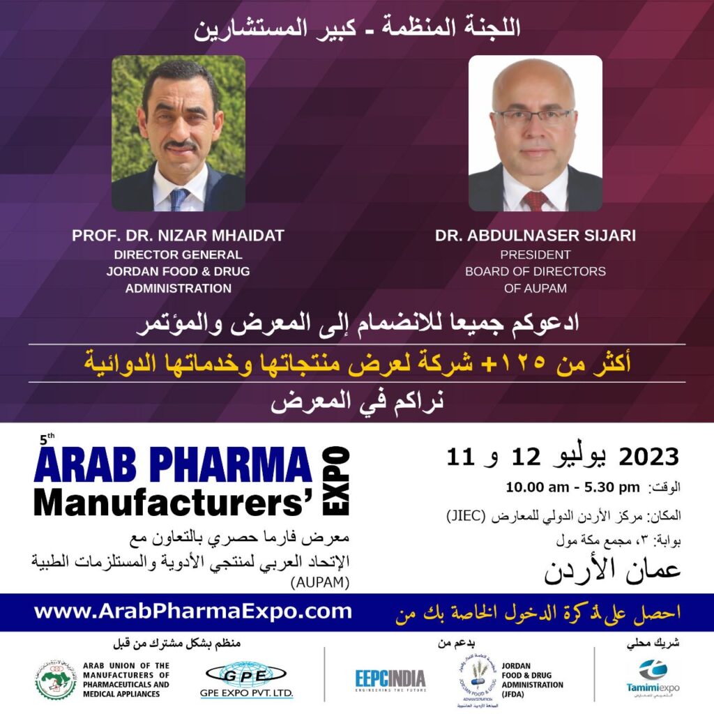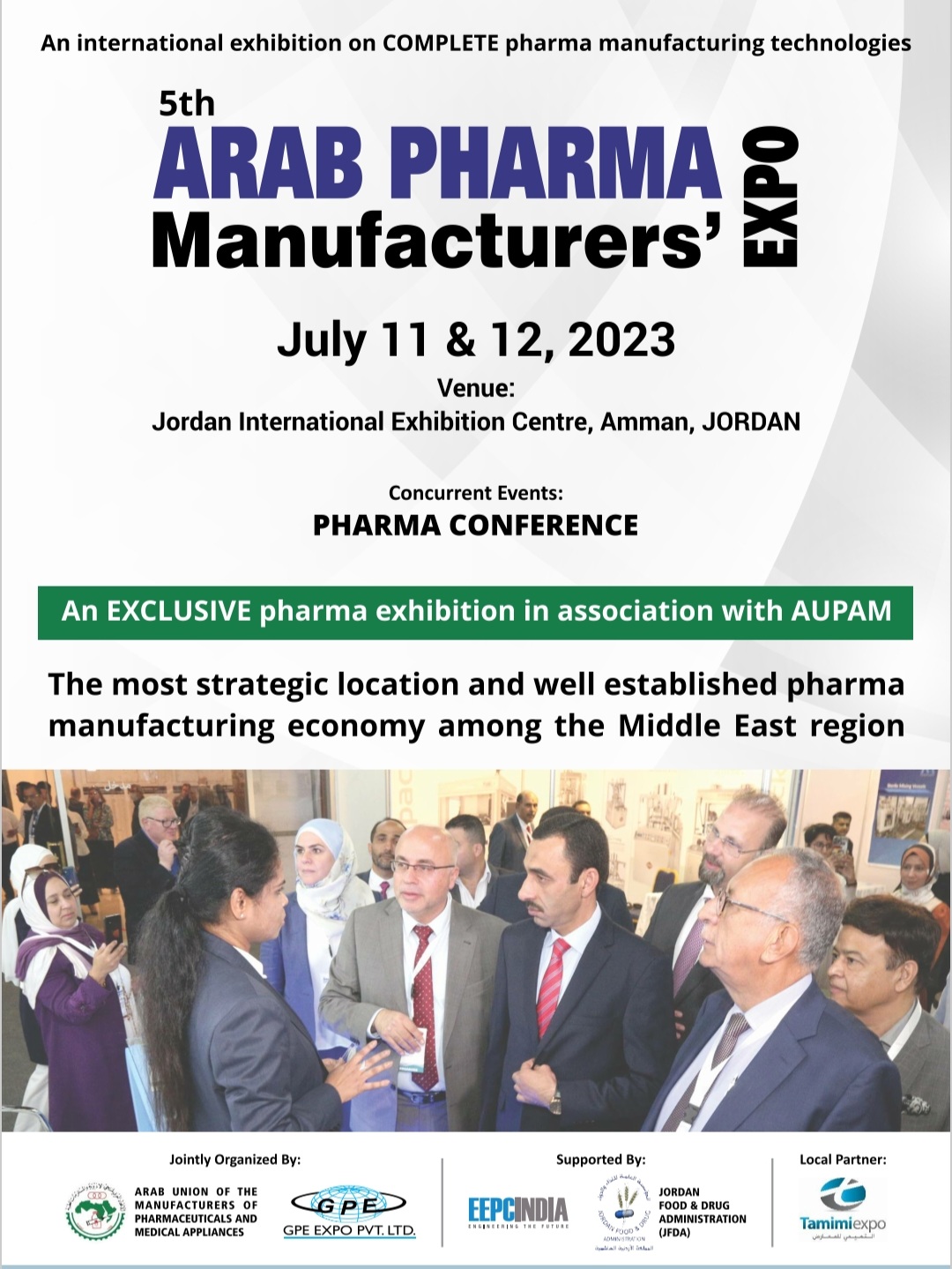 تحت رعاية مدير عام المؤسسة العامة للغذاء والدواء الدكتور نزار مهيدات، يعقد الاتحاد العربي لمنتجي الادوية والمستلزمات الطبية؛ ملتقى الصناعات الصيدلانية العربية السادس والعشرين بعنوان: ” توطين صناعة البدائل الحيوية وتوحيد التشريعات الناظمة لها في البلدان العربية”