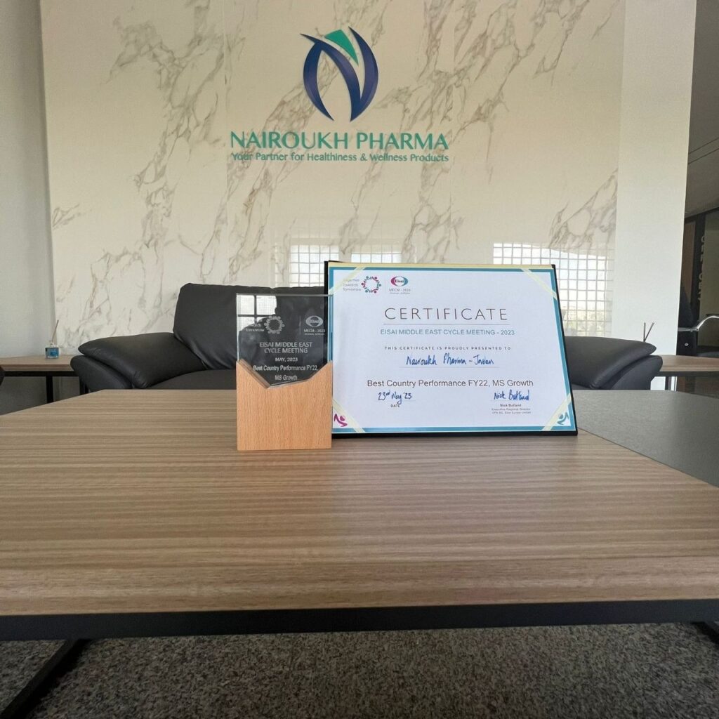حصلت نيروخ فارما على درع أفضل أداء لعام 2022 في منطقة الشرق الأوسط من قبل شركة Eisai اليابانية، وقد قام الدكتور أحمد عبندة مدير السوق بتسلم الجائرة ممثلا عن نيروخ فارما خلال الاجتماع السنوي لشركة Eisai مع الوكلاء المعتمدين في الشرق الأوسط.