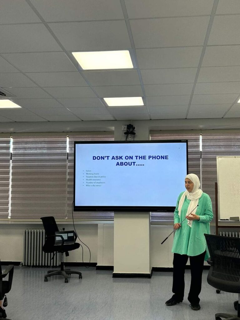 وقد ركزت الورش التدريبية على استراتيجيات التخطيط للوظيفة، واستكمال الدراسات العليا، وأهم النقاط التي يجب التركيز عليها أثناء مقابلات العمل، واستخدام الوسائل الإلكترونية لجذب أصحاب العمل إضافة إلى التفكير الإبداعي.