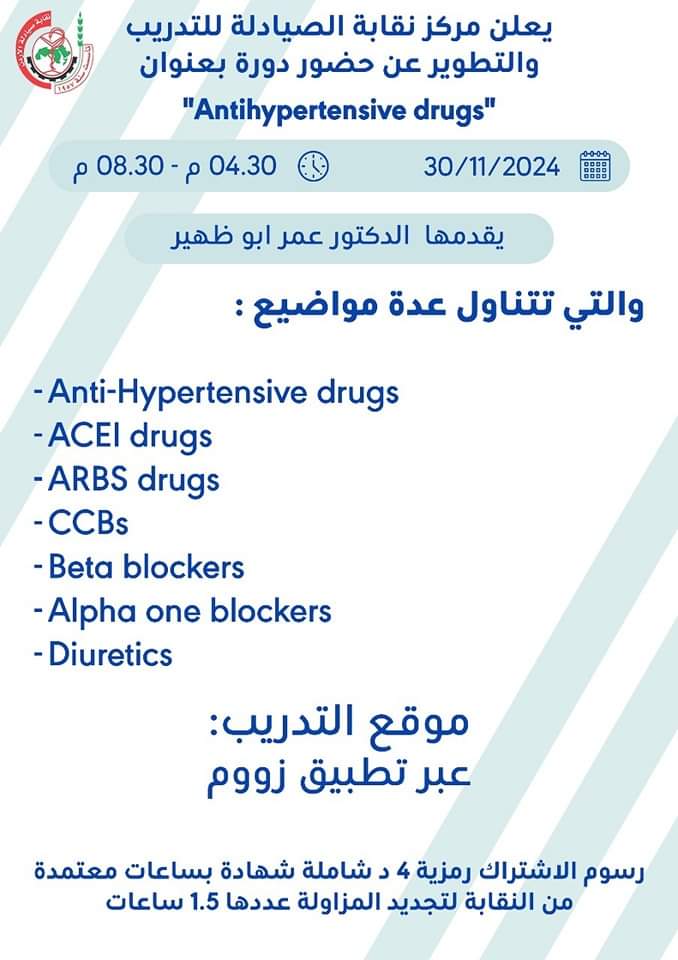 مركز نقابة الصيادلة للتدريب والتطوير يقيم دورة بعنوان ” Antihypertensive drugs “