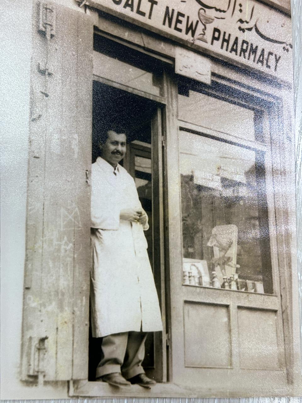 صورة عمرها أكثر من ٧٠ عاما.. الحمصي أمام صيدليته في مدينة السلط