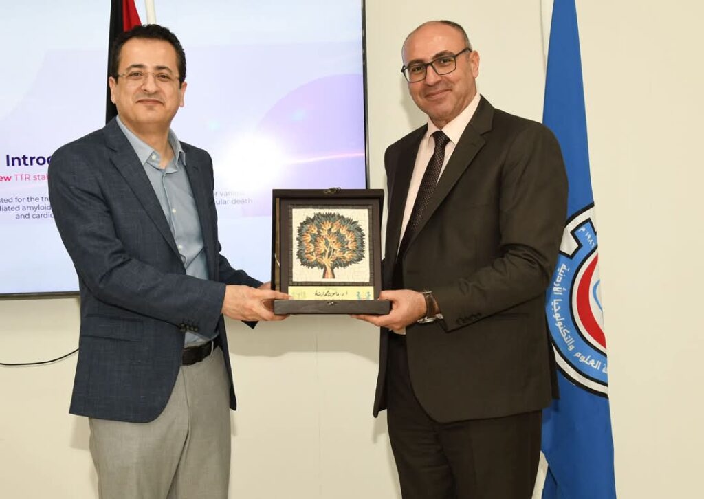 | كرمت جامعة العلوم والتكنولوجيا الأردنية، ممثلة بكلية الصيدلة، الأستاذ الدكتور مأمون حمادشة، أحد أبرز خريجيها، تقديرًا لإسهاماته العلمية المتميزة، وذلك بعد حصوله على موافقة هيئة الغذاء والدواء الأمريكية (FDA) على دوائه المبتكر Attruby (Acoramidis)، الذي يُعد علاجًا فعّالًا للتليف القلبي، مما يُشكّل قفزة نوعية في المجال الطبي والدوائي.وقدّم حمادشة محاضرة تفاعلية استعرض فيها تجربته الشخصية ومسيرته العلمية بدءًا من دراسته في جامعة العلوم والتكنولوجيا ، وحتى وصوله إلى اكتشاف العلاج، كما تطرّق إلى التحديات التي واجهها في رحلته العلمية، مؤكدًا على أهمية الاجتهاد والالتزام لتحقيق الطموحات العلمية.وأشار حمادشة إلى دور جامعة العلوم والتكنولوجيا الكبير في بناء أسس معرفته العلمية، التي مكنته من تحقيق هذا الإنجاز العالمي، كما قدّم نصائح للطلبة الحاضرين، داعيًا إياهم إلى الإيمان بقدراتهم والسعي نحو التميز العلمي والعملي.وحضر الحفل الذي جاء ضمن مبادرة لجنة الخريجين والأنشطة العلمية عميد كلية الصيدلة الأستاذ الدكتور قصي البلص وعدد من أعضاء الهيئة التدريسية والطلبة والخريجين. يُذكر أن حمادشة حاصل على درجة البكالوريوس في الصيدلة من الجامعة عام 1999، وهو حاليًا بروفيسور في كلية الصيدلة بجامعة المحيط الهادئ في كاليفورنيا بالولايات المتحدة الأمريكية، حيث يواصل تقديم إسهاماته المتميزة في الأبحاث الدوائية وتطوير العلاجات المبتكرة. |