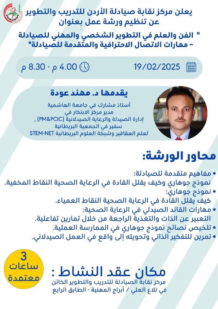 المكان: مركز نقابة الصيادلة للتدريب والتطوير – تلاع العلي / أبراج المهنية – الطابق الرابع
