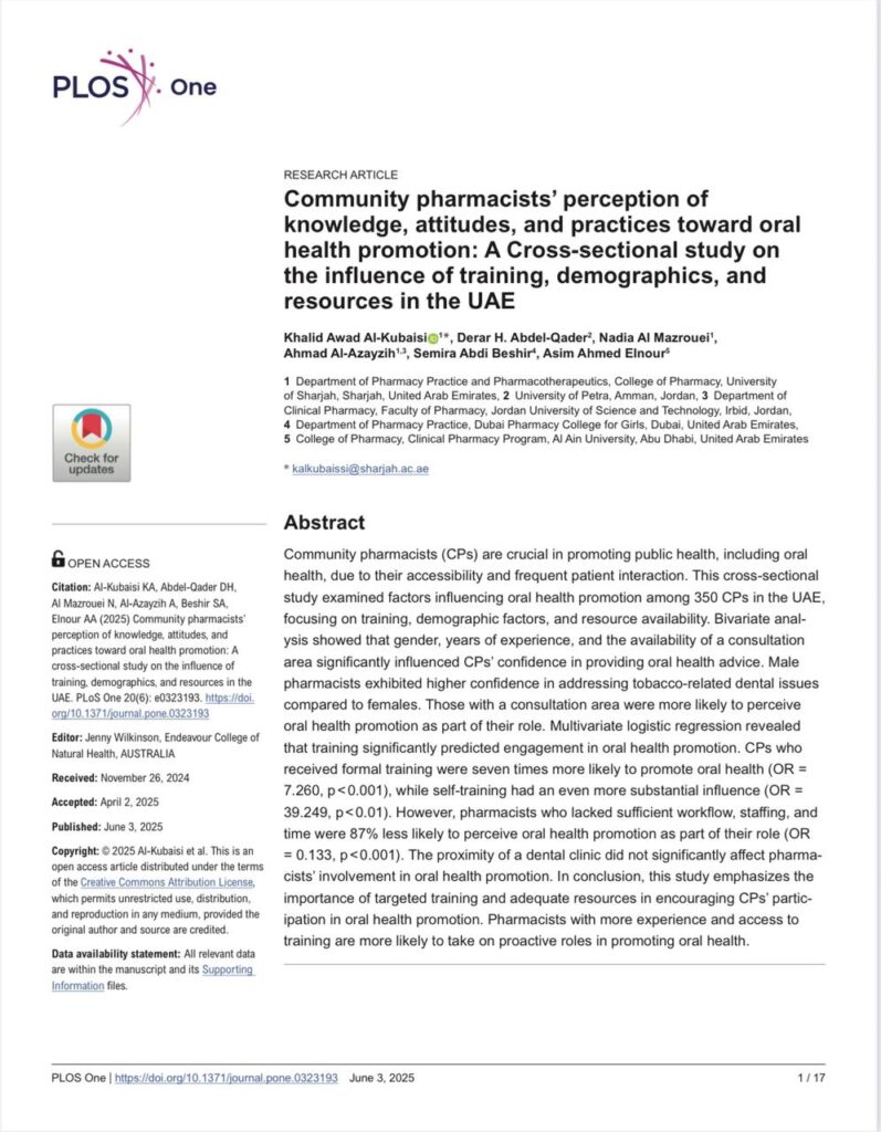 بلعاوي ينشر ورقة بحثية بعنوان ” إدراك الصيادلة المجتمعيين للمعرفة والمواقف والممارسات تجاه تعزيز الصحة الفموية”