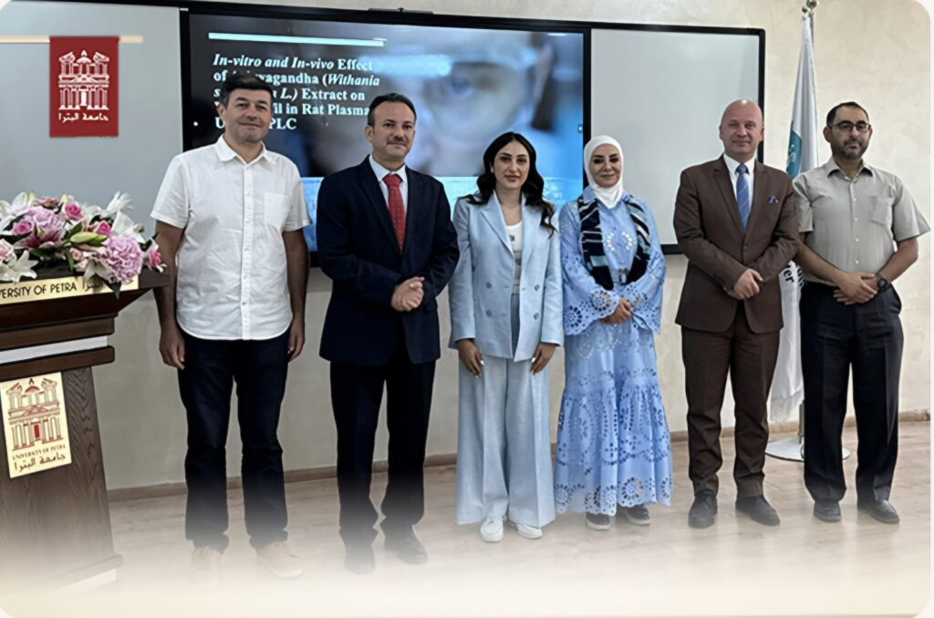 نوقشت في كلية الصيدلة والعلوم الطبية في جامعة البترا رسالة الماجستير المقدمة من الطالبة دالية رشيد فاضل الطائي ، وتحت إشراف الاستاذ الدكتور إياد الملاح,والدكتورة كنزا منصور ، بعنوان ” تأثير مستخلص الاشوغاندا على دواء الفاردينافيل في بلازما الفئران باستخدام كروماتوغرافيا السائل عالي الأداء “