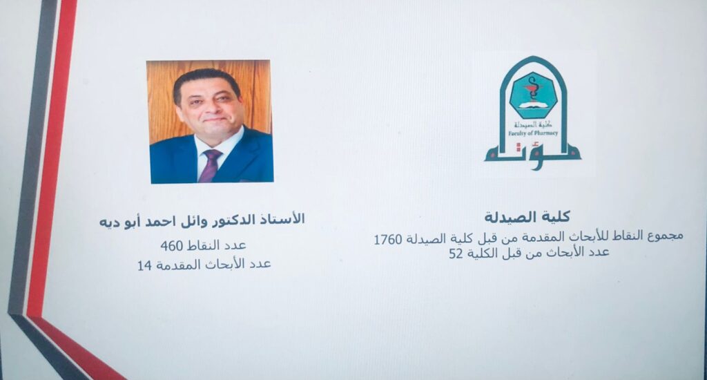 حصل الزميل الأستاذ الدكتور وائل أبودية على المركز الاول على كلية الصيدلة في مجال الأبحاث الصيدلانية، والمركز الثاني ترتيبا على مستوى الجامعه.