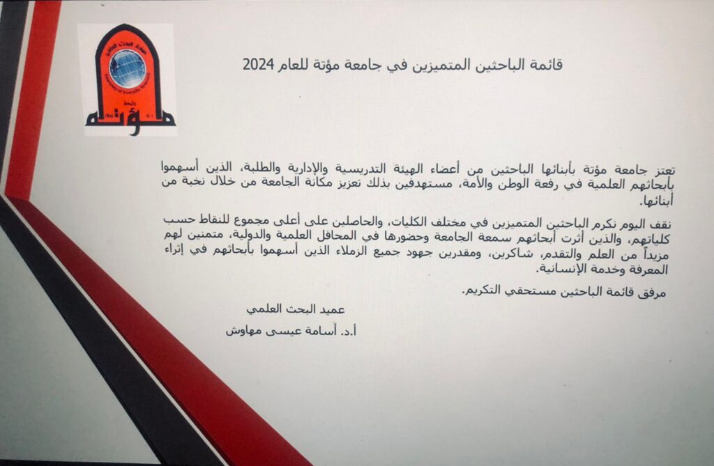 الزميل الاستاذ الدكتور وائل أبوديه باحثا متميزا في جامعة مؤته