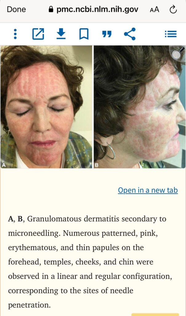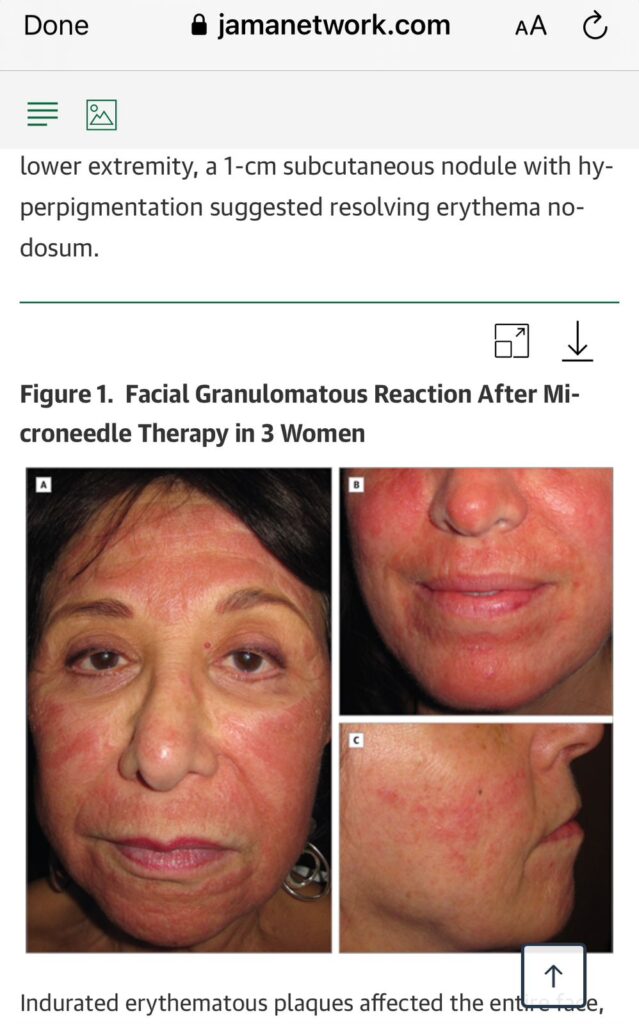 فقد نُشرت عدة دراسات حالة في مجلات علمية موثوقة مثل JAMA Dermatology وJAAD Case Reports، أظهرت حدوث تفاعلات حبيبية التهابية (Granulomatous reactions) عند عدد من الأشخاص بعد جلسات الميكرونيدلينغ عند استخدام مستحضرات تحتوي على فيتامين C أو فيتامين E أو مستخلصات عشبية أثناء الجلسة.