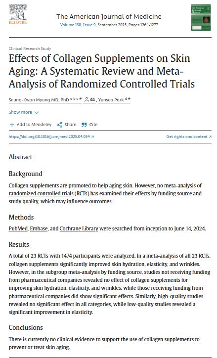 ولكن عندما قُسمت الدراسات حسب قوتها فالدراسات عالية الجودة لم تجد تأثير significant لمكملات الكولاجين على ترطيب أو مرونة أو تجاعيد البشرة بينما أظهرت الدراسات منخفضة الجودة تحسنًا في المرونة فقط. الخلاصة النهائية: لا يوجد حتى الآن أي دليل سريري قوي يدعم استخدام مكملات الكولاجين في منع أو علاج شيخوخة البشرة.