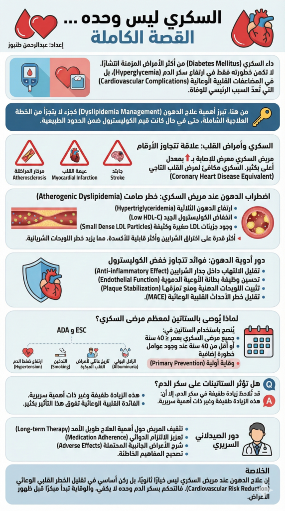 إن علاج الدهون عند مريض السكري ليس خيارًا ثانويًا، بل ركن أساسي في تقليل الخطر القلبي الوعائي (Cardiovascular Risk Reduction).
