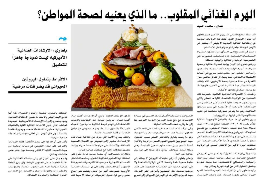 في خطوة أطلقت جدلاً نارياً بين العلماء وصناع السياسات في جميع أنحاء العالم، كشفت الولايات المتحدة النقاب عن تعديل تاريخي في المبادئ التوجيهية الغذائية الوطنية. إن “المبادئ التوجيهية الغذائية للأمريكيين 2025 – 2030″، الصادرة في 7 يناير 2026، تنحو بشكل حاد نحو فلسفة “الغذاء الحقيقي”، حيث تُروج لزيادة البروتين ومنتجات الألبان كاملة الدسم بينما تعلن الحرب على الأطعمة فائقة المعالجة. يقود هذه التحول وزير الصحة الأمريكي روبرت ف. كينيدي جونيور، ويُصوَّر على أنه إعادة ضبط ضرورية لمواجهة أزمة صحية وطنية تستهلك فيها الأمراض المزمنة المرتبطة بالنظام الغذائي ما يقارب 90٪ من الإنفاق على الرعاية الصحية. يقول أستاذ العلاج الدوائي السريري الدكتور ضرار بلعاوي: ألاحظ أن هذا ليس مجرد تغيير في النصيحة الغذائية، بل هو دراسة حالة عميقة لكيفية تقاطع العلم والسياسة والتجارة، مع تداعيات تتجاوز بكثير الشواطئ الأمريكية لتصل إلى دول مثل الأردن، حيث تعتبر التحولات الغذائية وأعباء الأمراض المزمنة من الهموم الملحة أيضاً.