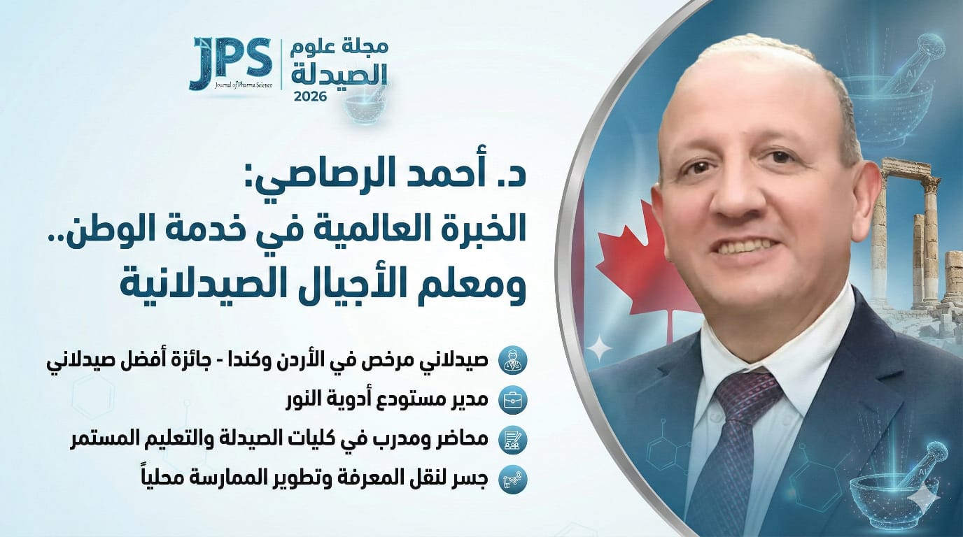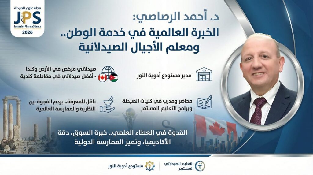الدكتور أحمد الرصاصي هو الدليل القاطع على أن الصيدلاني الأردني قادر على المنافسة والتفوق عالمياً، والأهم من ذلك، أنه قادر على أن يكون جسر عبور ينقل تلك الخبرات العالمية لتطوير المهنة محلياً.