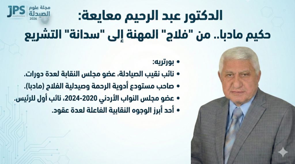 في مدينة الفسيفساء والتاريخ، مادبا، حيث تمتزج الأصالة بالحداثة، يبرز اسم الدكتور عبد الرحيم معايعة كأحد العلامات الفارقة التي تجاوزت حدود الصيدلية لتصل إلى أروقة العمل النقابي وقبة البرلمان.