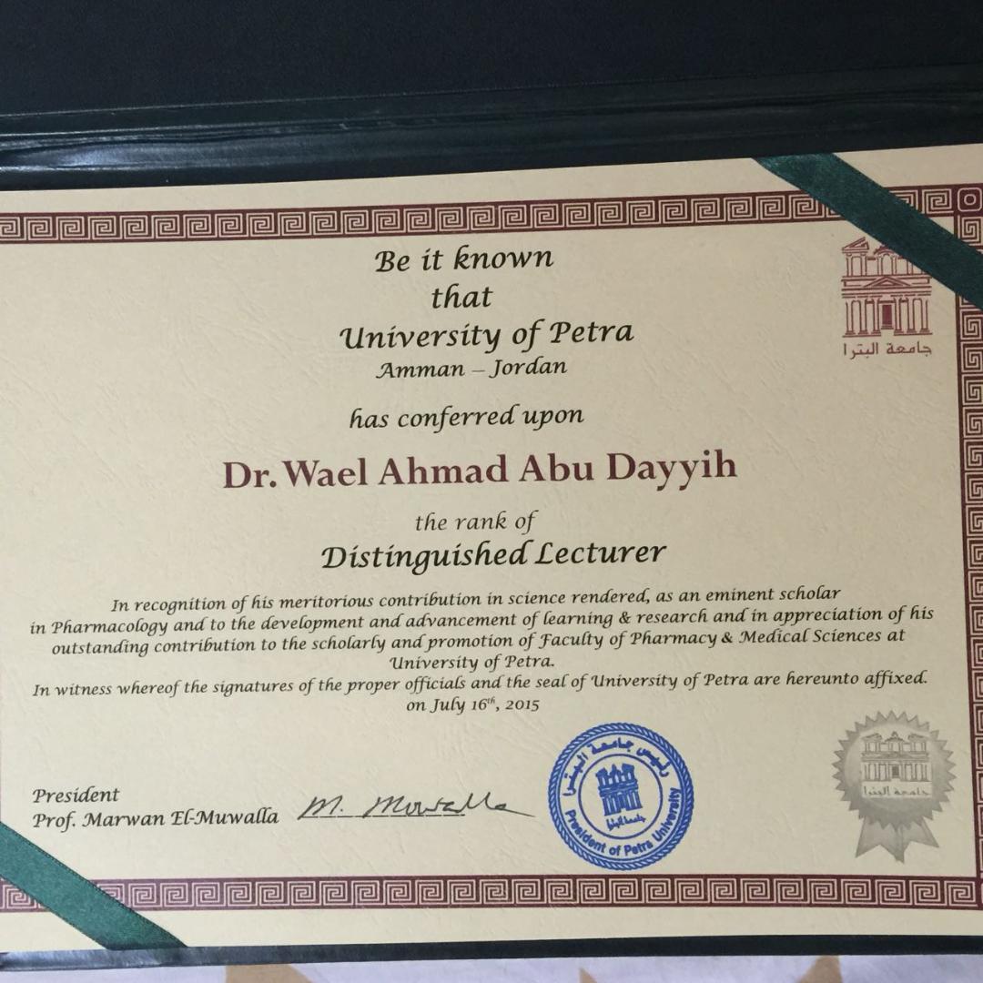 وحصل على جائزة المدرس المتميز بجامعة البترا ٢٠١٥