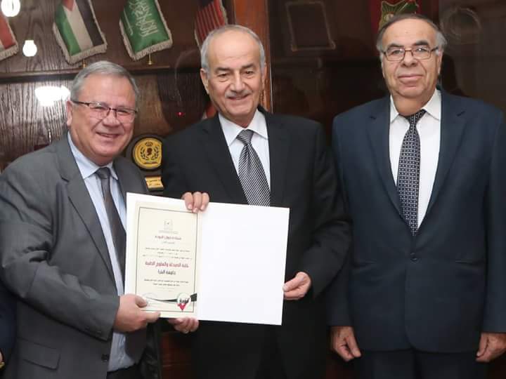 جامعة البترا ممثلة برئيس الجامعة الاستاذ الدكتور مروان مولا وعميد كلية الصيدلة والعلوم الطبية الاستاذ الدكتور توفيق عرفات يتسلمان شهادة ضمان الجودة والتي حصلت عليها كلية الصيدلة والعلوم الطبية / جامعة البترا ، من رئيس هيئة الاعتماد معالي الدكتور بشير الزعبي.