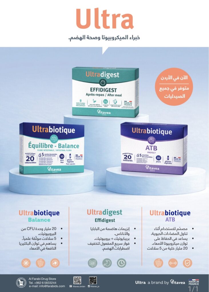 في إطار التزامه المستمر بتوفير أحدث الحلول الطبية والصحية المبتكرة في السوق الأردني، أعلن مستودع أدوية الفارابي عن الإطلاق الرسمي لمجموعة منتجات “ألترا” (Ultra)، العلامة التجارية الفرنسية الرائدة من إنتاج شركة “فيتافيا” (Vitavea)، والمصنفة كخبيرة في مجال الميكروبيوتكا وصحة الهضم.