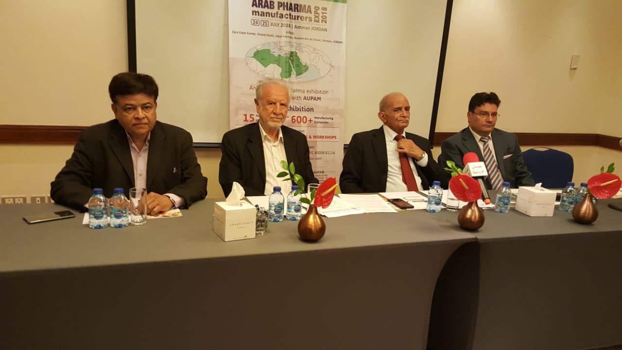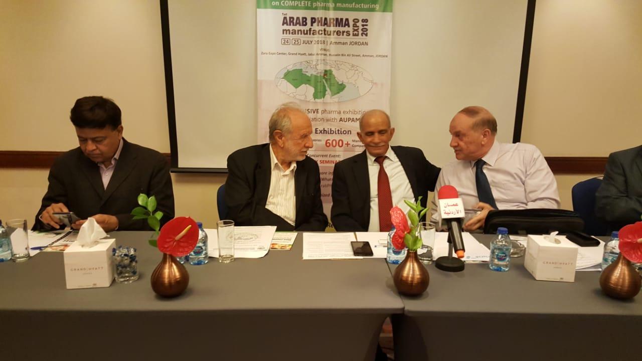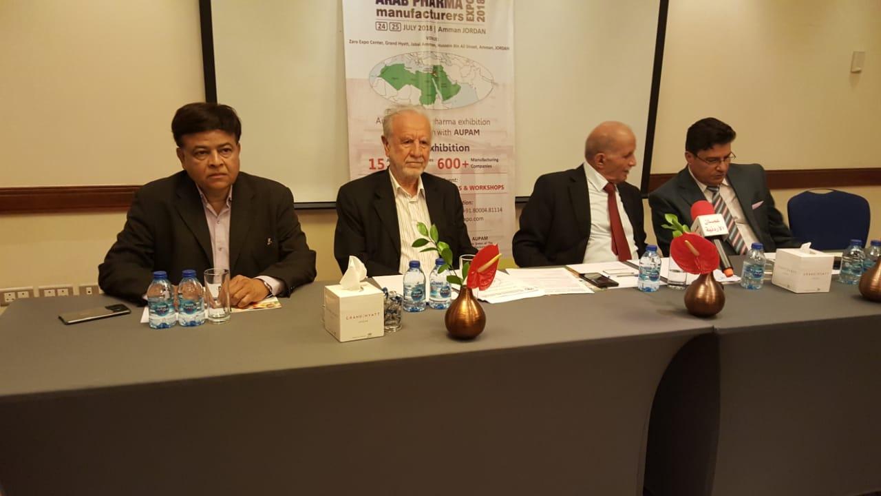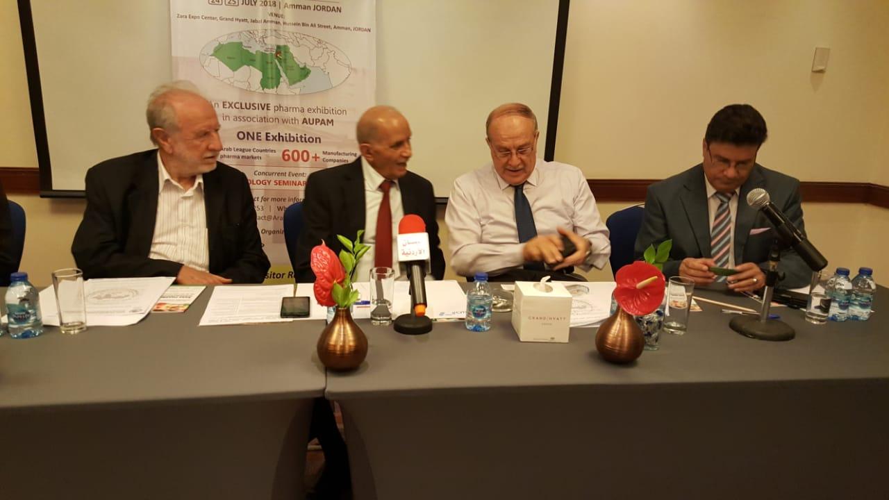 أقام الاتحاد العربي لمنتجي الادوية والمسلتزمات الطبية، مؤتمر صحفيا في فندق حياة عمان ظهر يوم السبت الموافق 21/7/2018، بحضور نائب رئيس الاتحاد د. نادر شغليل والأمين العام للإتحاد د. عدنان الكيلاني والدكتور عمر جعوان عضو مجلس إدارة الاتحاد ومسؤول الأنشطة والسيد منذر التميمي والسيد باريش جهورمارفالا من الشركة المنظمة للمؤتمر.