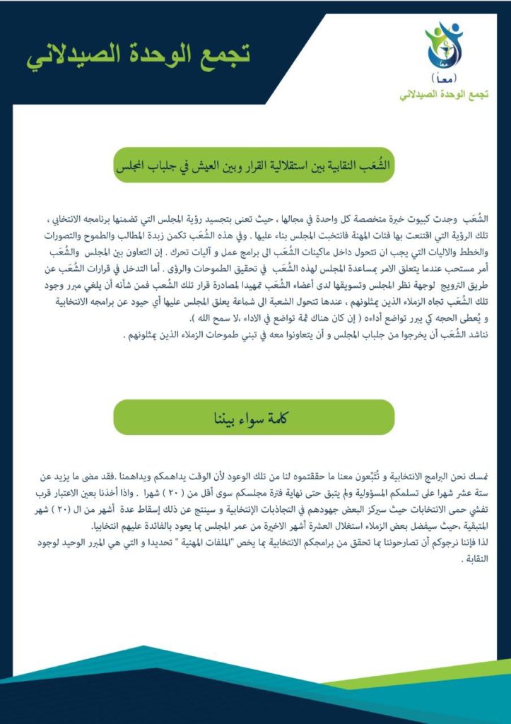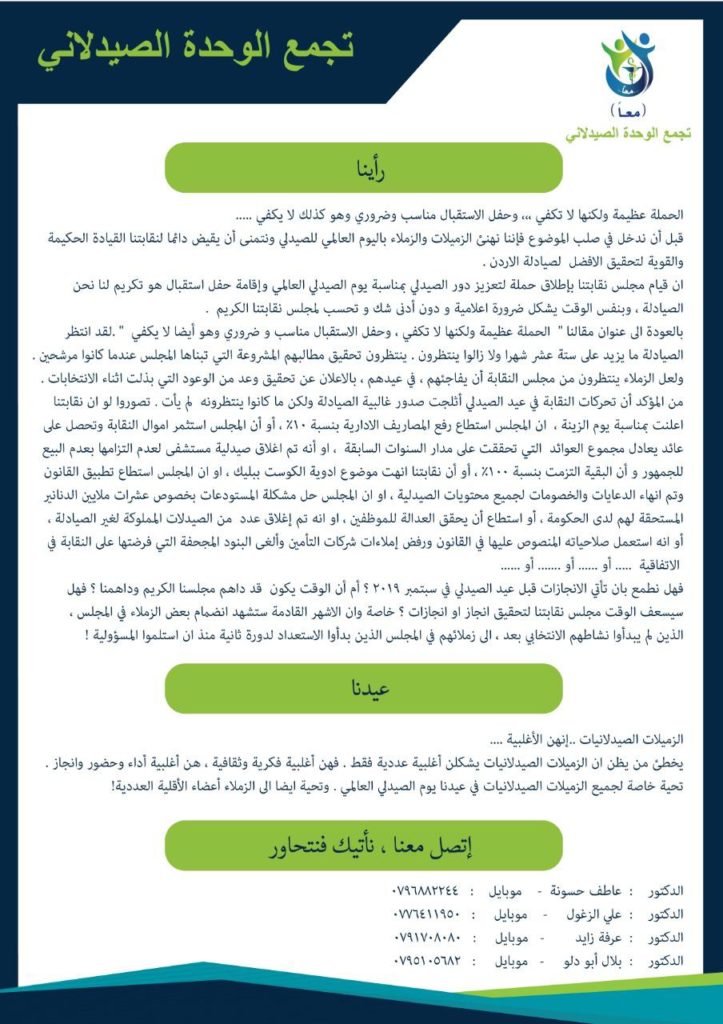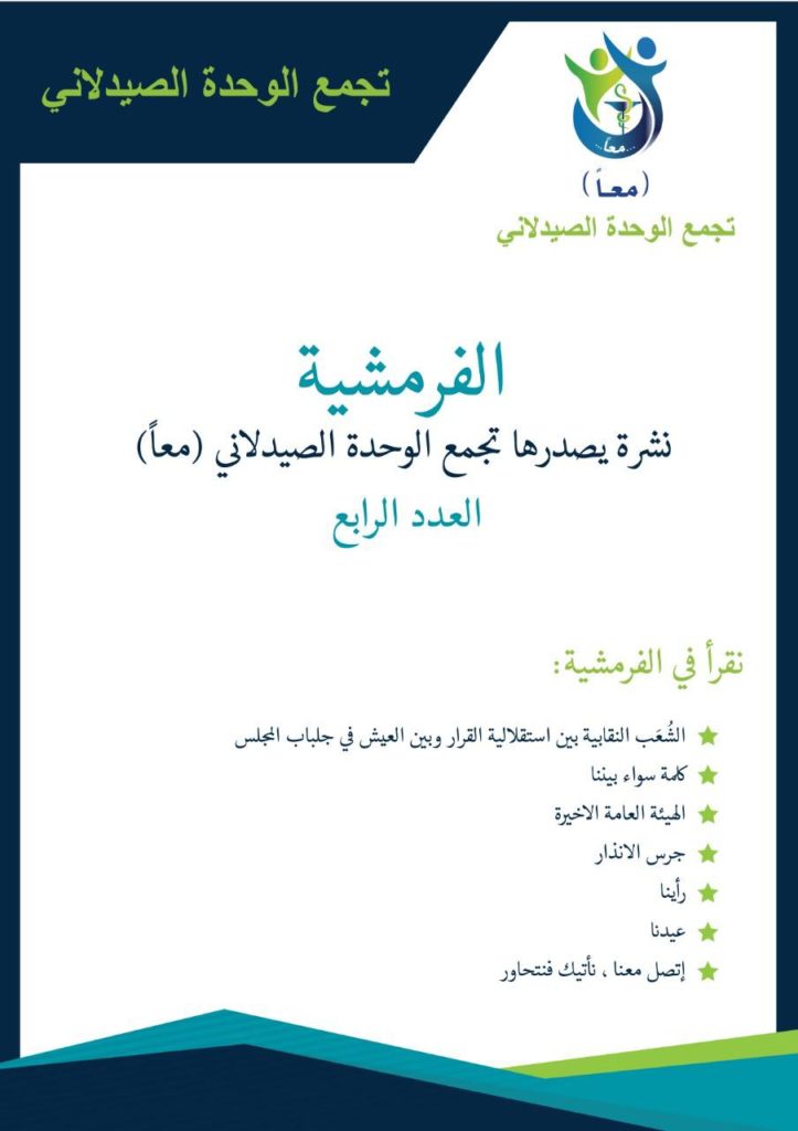 تجمع الوحدة الصيدلاني ” معا ” في نشرته الرابعة: ننتظر منذ 16 شهر أي إنجاز لمجلس النقابة !