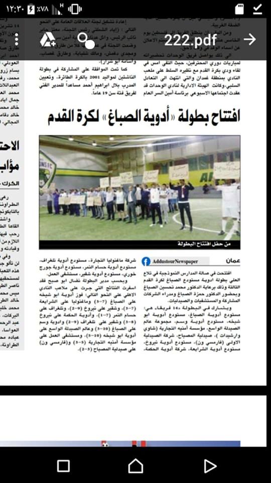 قال السيد نضال ابو صبح، مدير ومنسق بطولة الصباغ الكروية، ان فريقي أدوية الحكمة ومستودع ادوية خوري نمكنوا من بلوغ نهائي بطولة الصباغ الكروية الثالثة، وذلك بعدما تغلبت شركة الحكمة على مستودع أدوية شقير بفارق الركلات الترجيحية وبواقع7/6 ،كما بلغ مستودع ادوية خوري بعد فوزه في مباراة النصف نهائي الثانية على فريق مستودع أدوية ابو شيخة وبواقع6/3. وذلك على ملاعب النادي الأهلي. وبحضور جمهور غفير من القطاع الطبي. حيث ستقام المباراة النهائية يوم الجمعة بتاريخ 2/11 .