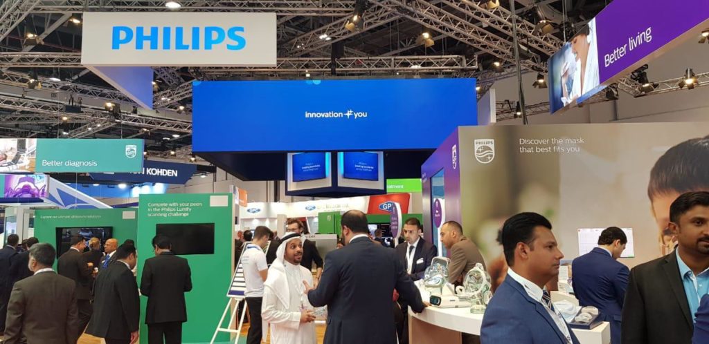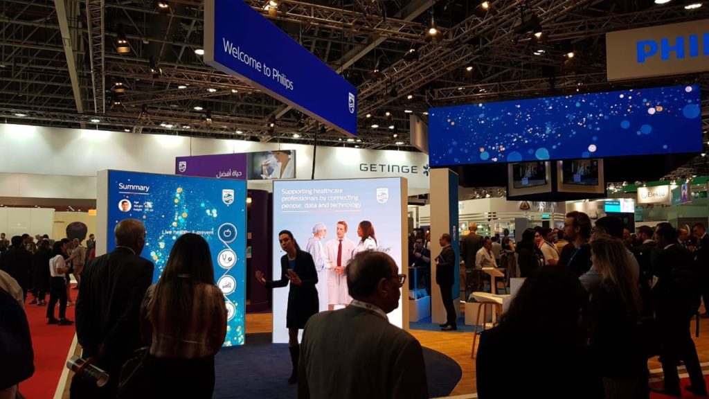 في اليوم الثاني من معرض الصحة العربي قام فريق Business Box بزيارة قاعات التكنولوجيا الرقمية والمعدات الطبية في المعرض ، فبدا واضحاً التنافس الكبير بين كل من شركتي Philips و Siemens، حيث عرضت كل منهما أجهزة وحلول طبية مبتكرة حول آلية معرفة وتشخيص المرض عبر الانترنت واستخدام التطبيقات الذكية دون الحاجة في كثير من الأحيان إلى الوصول إلى الطبيب أو العيادة.