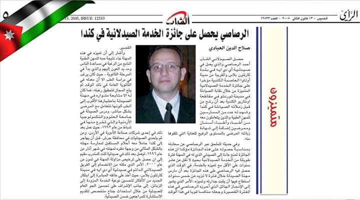 د. احمد الرصاصي وذكريات عن فوزه بجائزة ” الخدمة الصيدلانية المتميزة” الكندية عام 2004