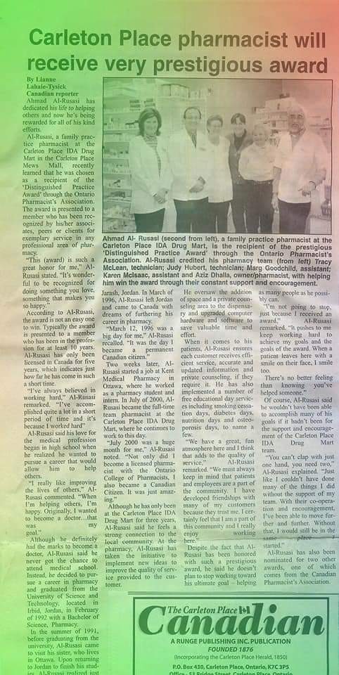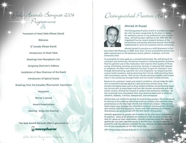 It happed 14 years ago.. 2004, I was the recepient of the distinguished pharmacy practice award from OPA. It was never to happened without the help and cooperative team work of my colleagues and coworkers. As what I always say:there is no I in TEAM WORK . Thanks to everybody and to everyone I worked with at Carleton place IDA, Kent medical pharmacy. Stittsville IDA and Richmond IDA. And May God bless the sole of my mentor for 20 years”Aziz Dhalla”.