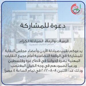 مجلس نقابة الصيادلة يوجه دعوة للمشاركة في وقفة تضامنية مع غزة يوم غد الاثنين الزميلات والزملاء الصيادلة الكرام يدعوكم